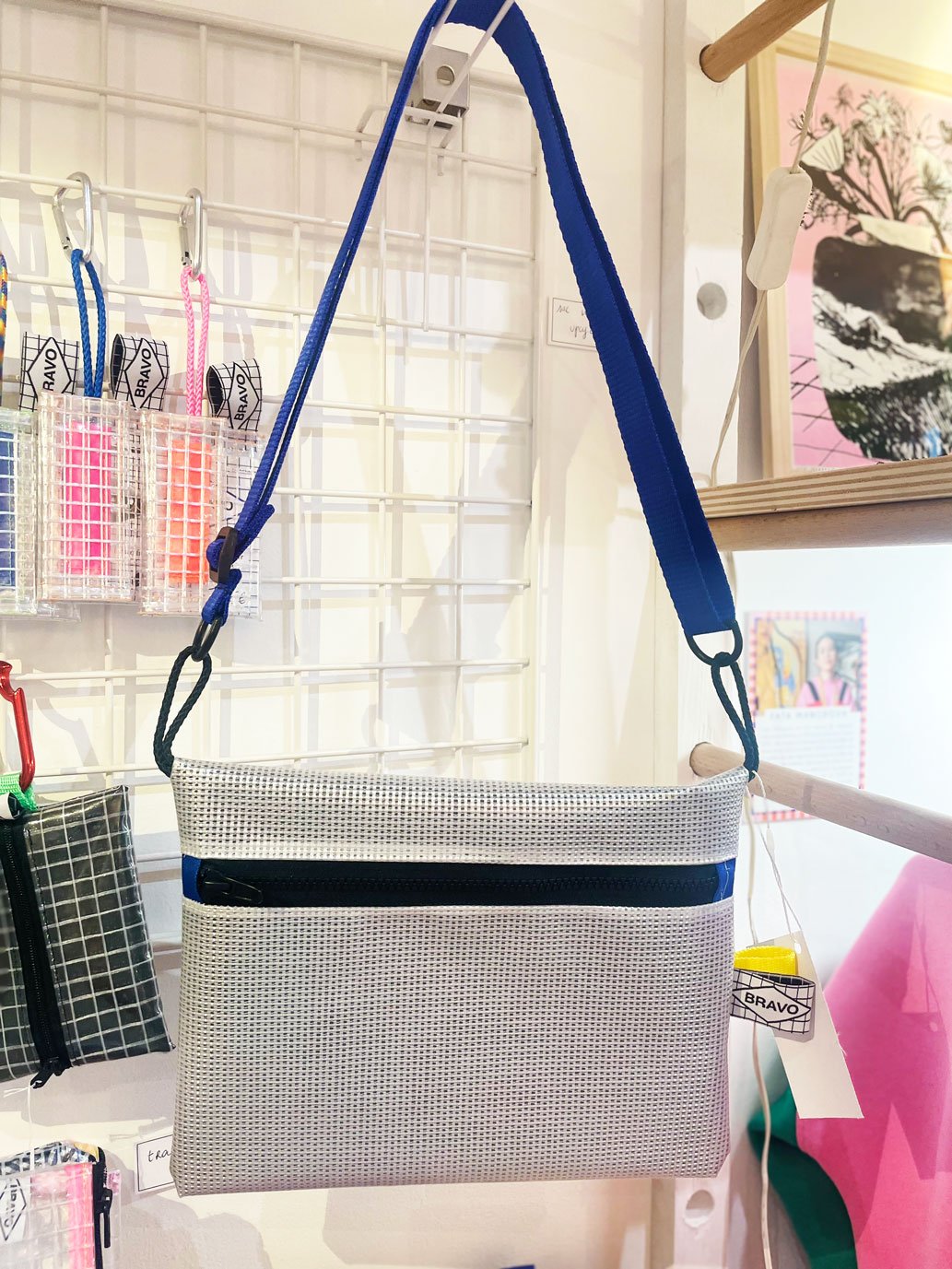 Ce nouvel objet est une pochette plate de grand format. Elle s'ouvre par une fermeture a glissière YKK de 6mm. Elle est de forme rectangulaire et fabriquée avec une toile plastique de haute densité. Elle possède une trame resserrée et un motif quadrillé. Elle est doublée par une toile nylon ou coton. Elle est imperméable. Elle possède de petits liens sur les côtés et une sangle réglable. Elles sont toutes différentes.