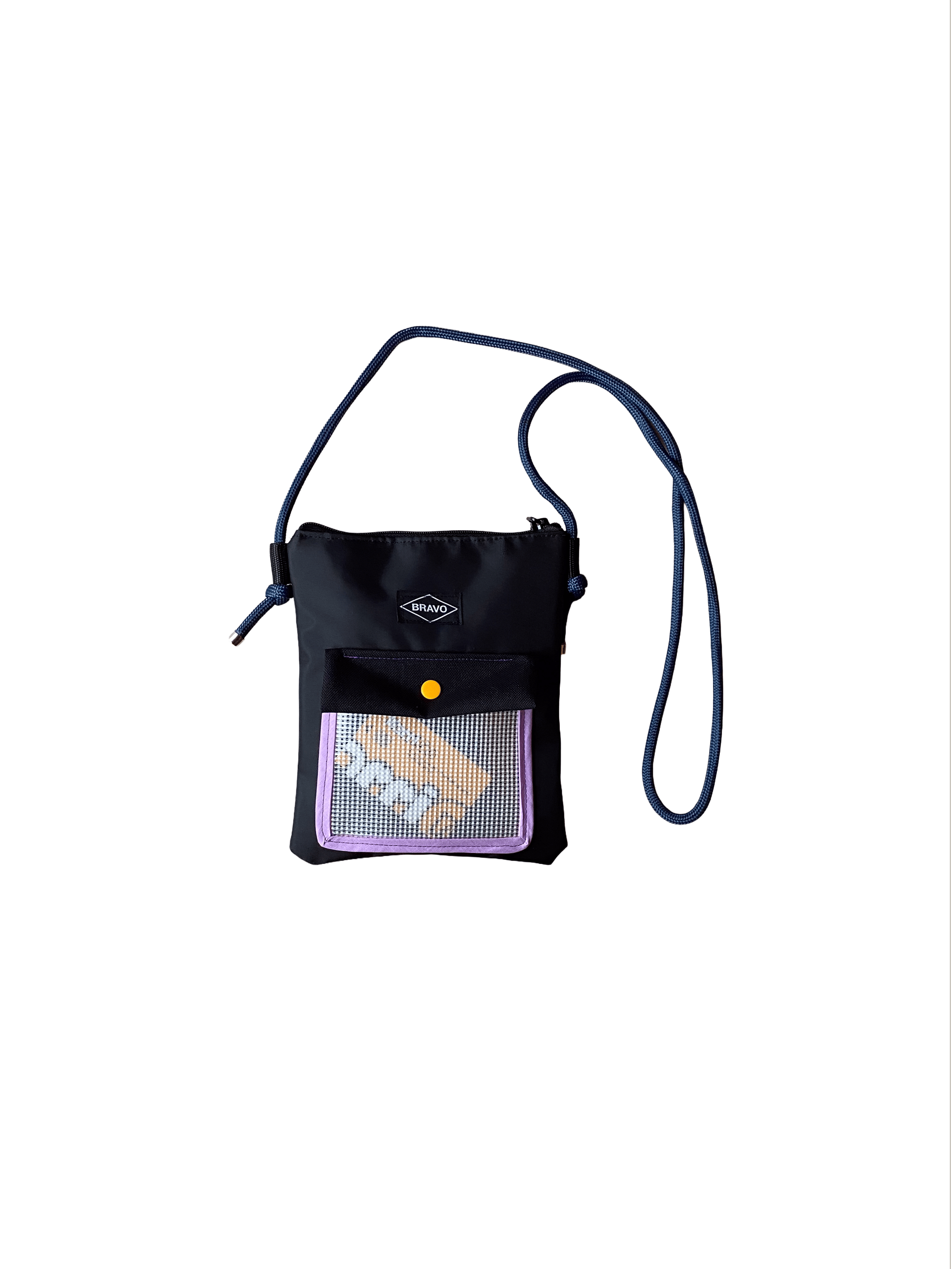 Cette pochette se porte en travers du buste. Elle se compose d'une partie principale rectangulaire doublée qui se ferme par un zip sur le dessus ainsi qu'une petite poche avant qui se ferme par une pression en plastique. Le lien est gris anthracite.