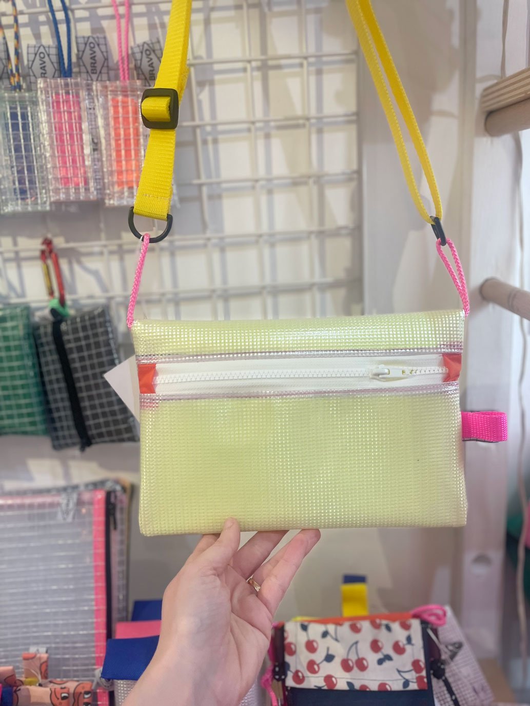 Pochette plate qui se porte en travers du buste. Elle s'ouvre par une fermeture a glissière YKK de 6mm. Elle est de forme rectangulaire et fabriquée avec une toile plastique de haute densité. Elle possède une trame resserrée et un motif quadrillé. Elle est doublée par une toile nylon ou coton. Elle est imperméable. Elle possède de petits liens sur les côtés et une sangle réglable.