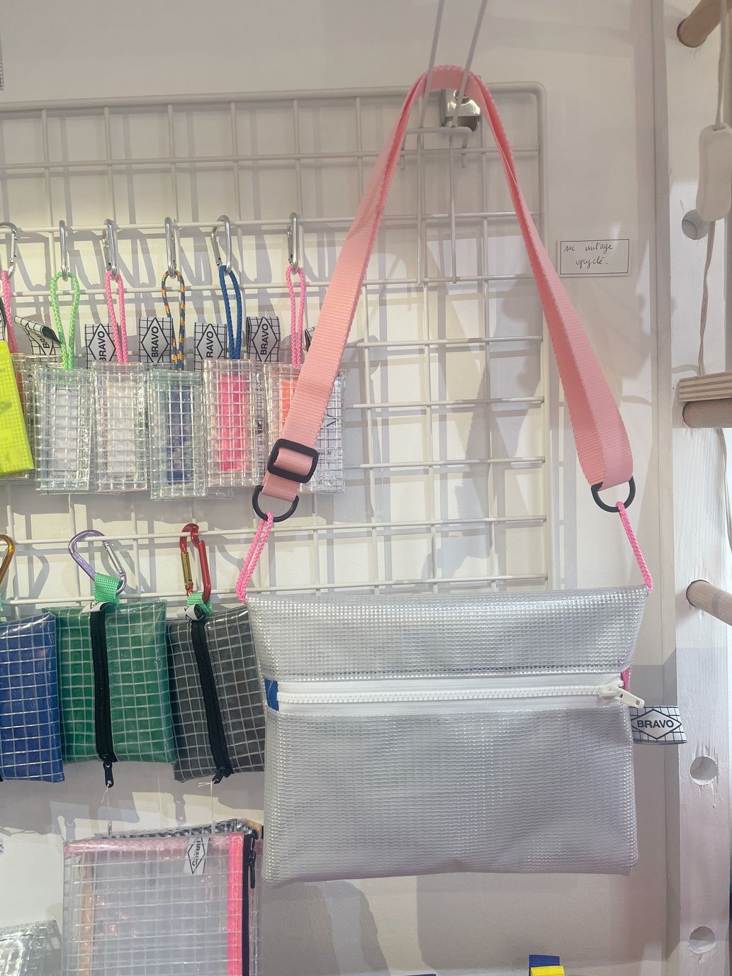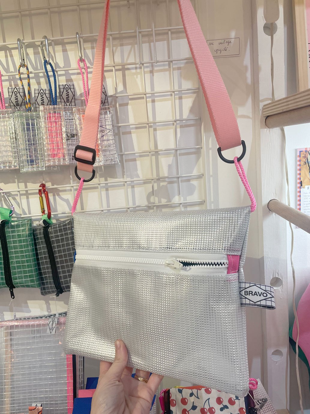 Grande pochette plate. Elle s'ouvre par une fermeture a glissière YKK de 6mm. Elle est de forme rectangulaire et fabriquée avec une toile plastique de haute densité. Elle possède une trame resserrée et un motif quadrillé. Elle est doublée par une toile nylon ou coton. Elle est imperméable. Elle possède de petits liens sur les côtés et une sangle réglable. Elle a des reflets métallisés du au tissu intérieur argenté.