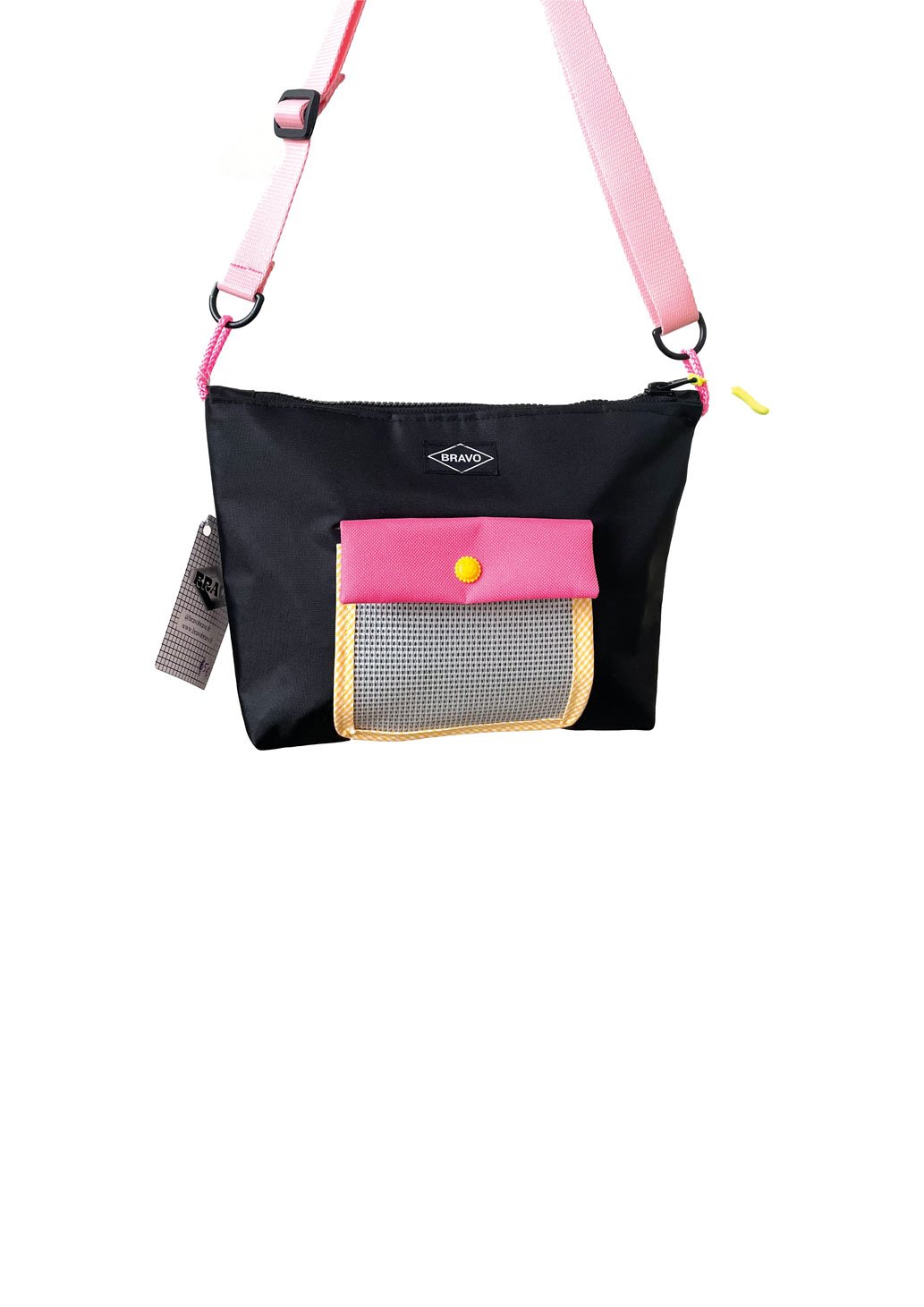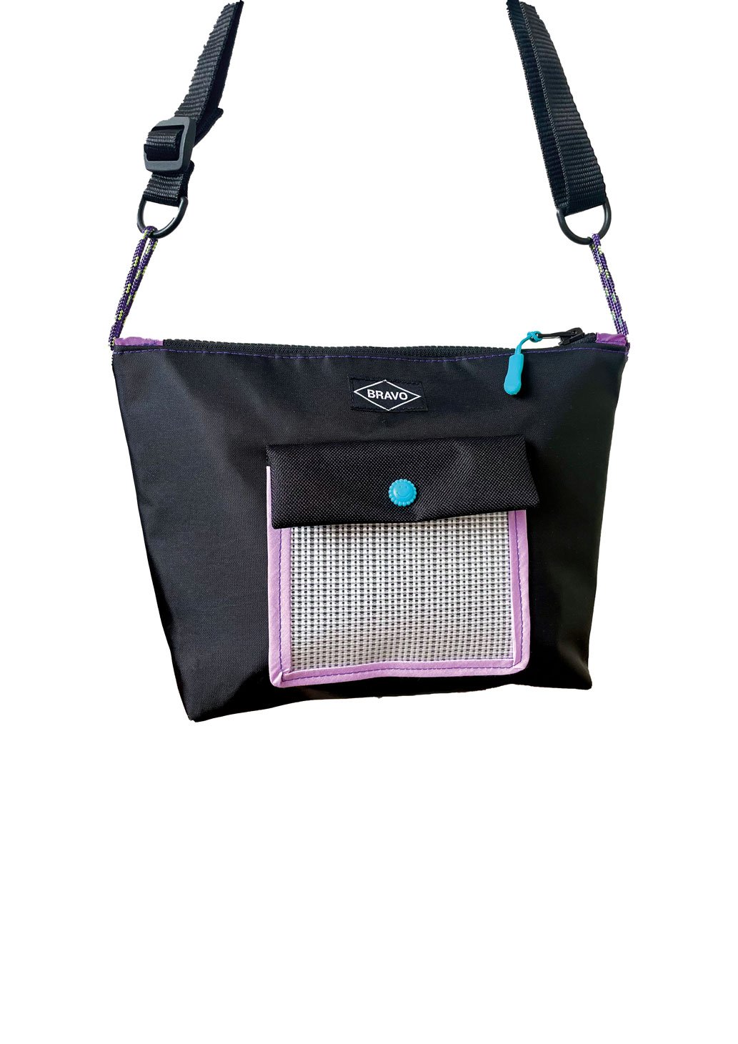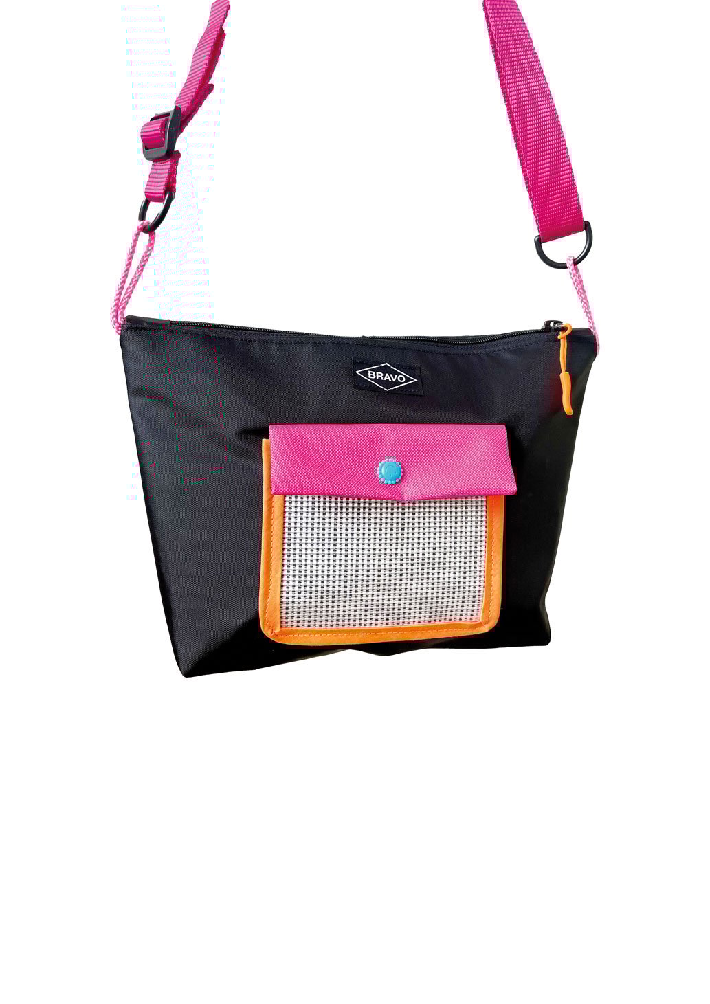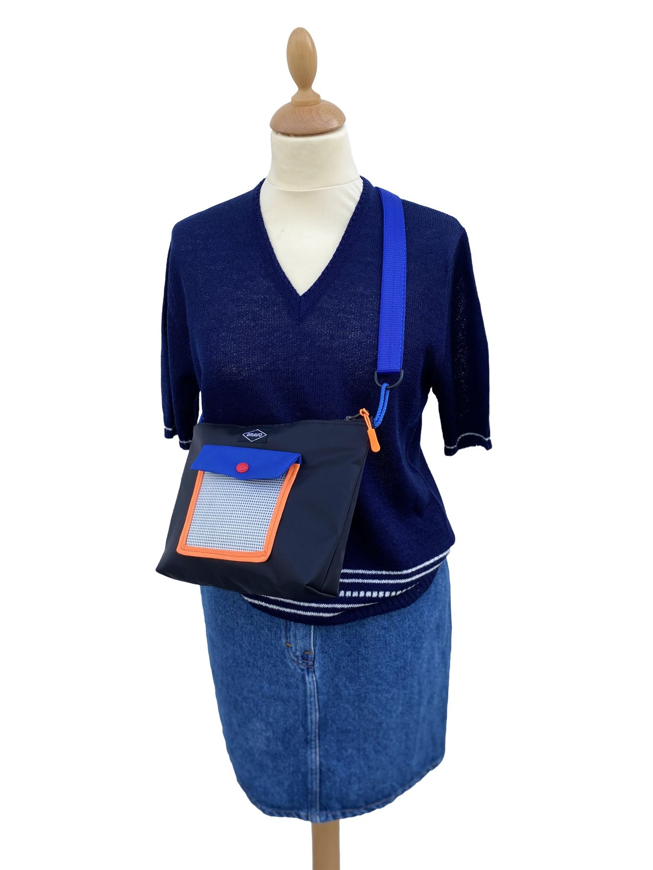 Il s'agit d'un sac d'une assez grande contenance. Il s'ouvre sur le haut grace a une fermeture à glissière ykk de 5mm noire. Le sac est doublé d'une toile PVC, il est donc imperméable. Sur sa face avant une poche s'ouvre et se ferme avec une pression colorée.Elle peut contenir une carte de transport ou des petits objets indispensables. Le sac est réglable et peut se porter court sur l'épaule ou en travers du buste.
