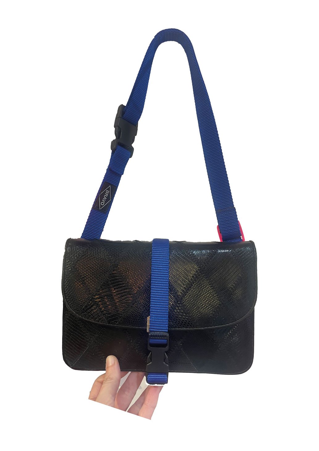 Sac vintage en cuir noir (patchwork de cuir). Intérieur et extérieur en TBE. il possèdent deux compartiments et deux petites poches. Il se ferme avec une boucle en nylon de 20mm et se porte en travers du buste, sur l'épaule ou autour de la taille. Sangle bleue royal et boucle de réglage rose fluo.