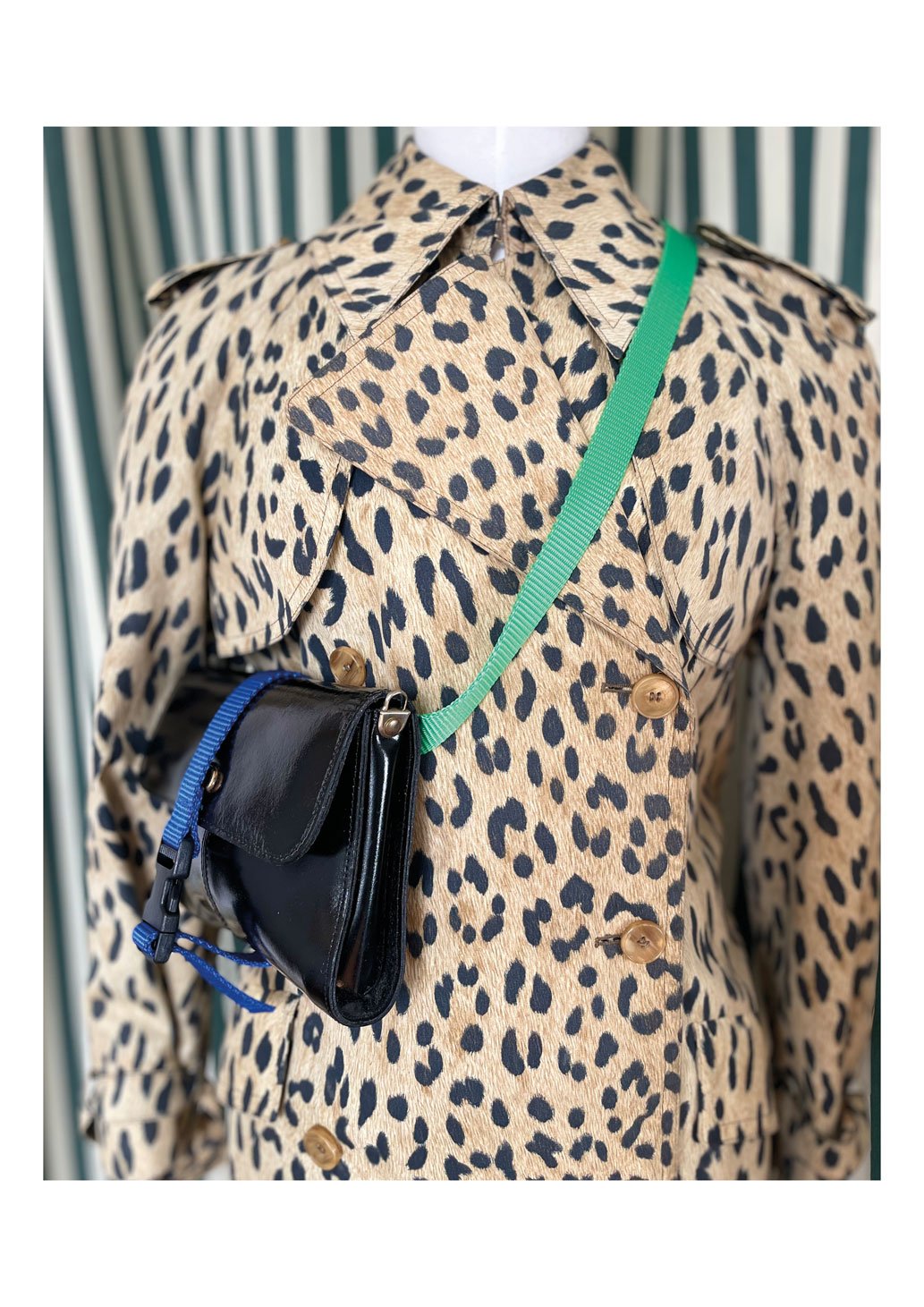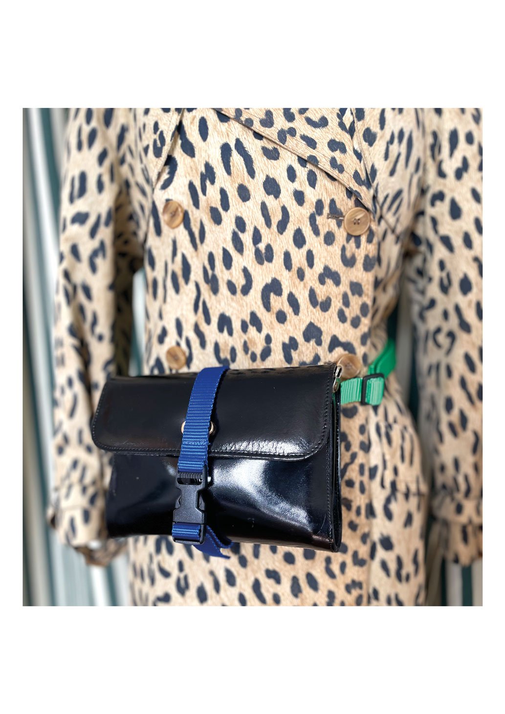 Petit sac en cuir vernis de couleur noir, il est en très bon état. Il peut se porter autour de la taille ou en travers du buste. largeur de sangle 20mm Dimensions : 20 x 13 cm , prof 3cm