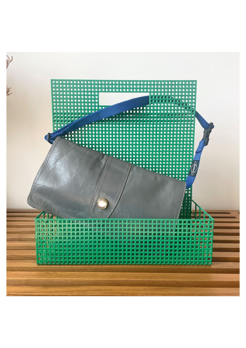 Sac en cuir lisse de couleur gris clair. Il s'agit ici d'un assez grand format. Il se présente avec un grand volume intérieur et se ferme par un rabat en cuir. Il a une jolie patine et un très joli cercle de nacre au centre. Il peut se porter court ou long grâce a sa sangle réglable de 20mm en polyester bleu royal.