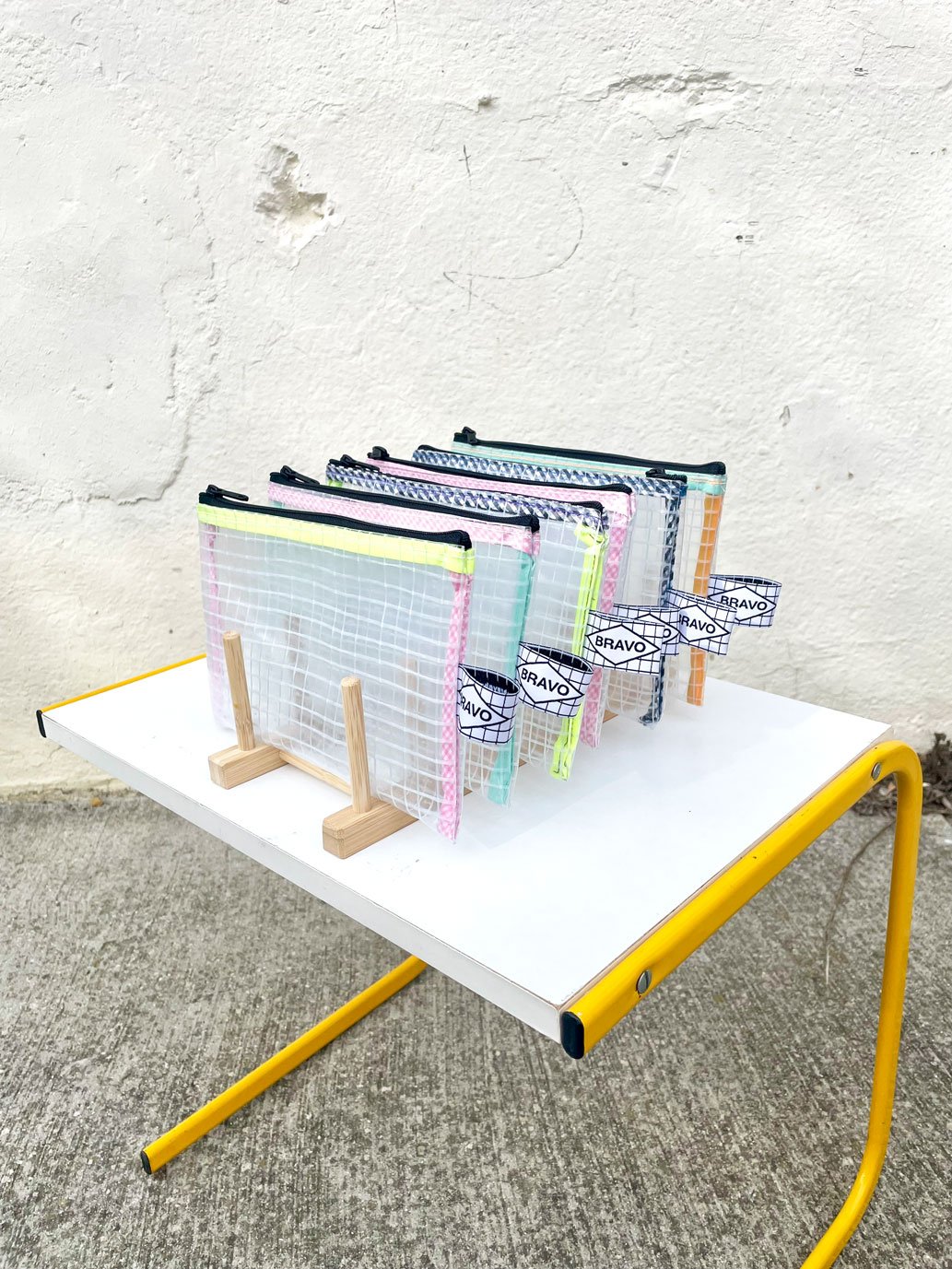 Nouvel objet : la trousse. Elle se ferme avec un zip ykk de 3mm noir. Les biais ressortent et apportent une touche colorée à cet objet tout en transparence. Couleurs fluos, et motif vichy.